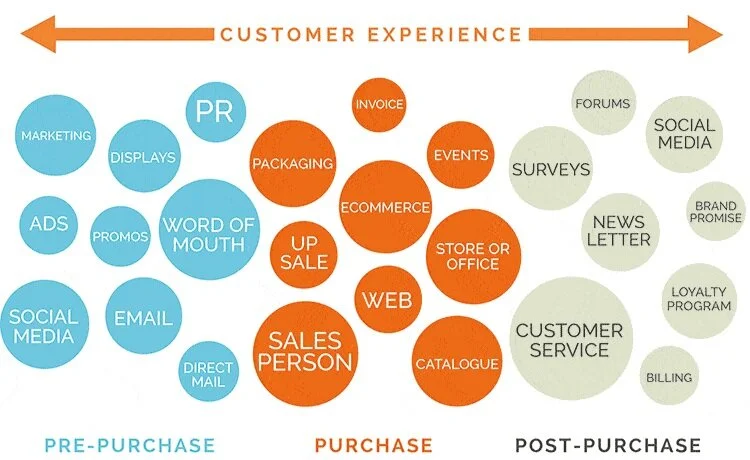 The Customer Journey indicates the steps and process (how and when) your customers go through when connecting and engaging with your brand to achieve a goal with your company. There are three instances in which a customer may come into contact with a brand: