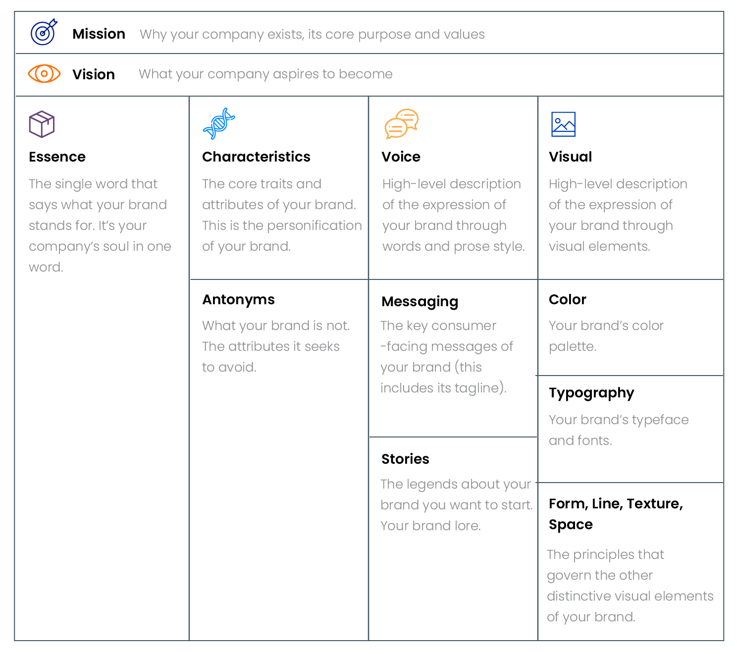 Brand Essence brings together concepts such as values, attributes, personality and visions to determine what you stand for as a company, and acts as a blueprint for the actions to be taken by your brand and team. Your actions will be guided by these established principles.