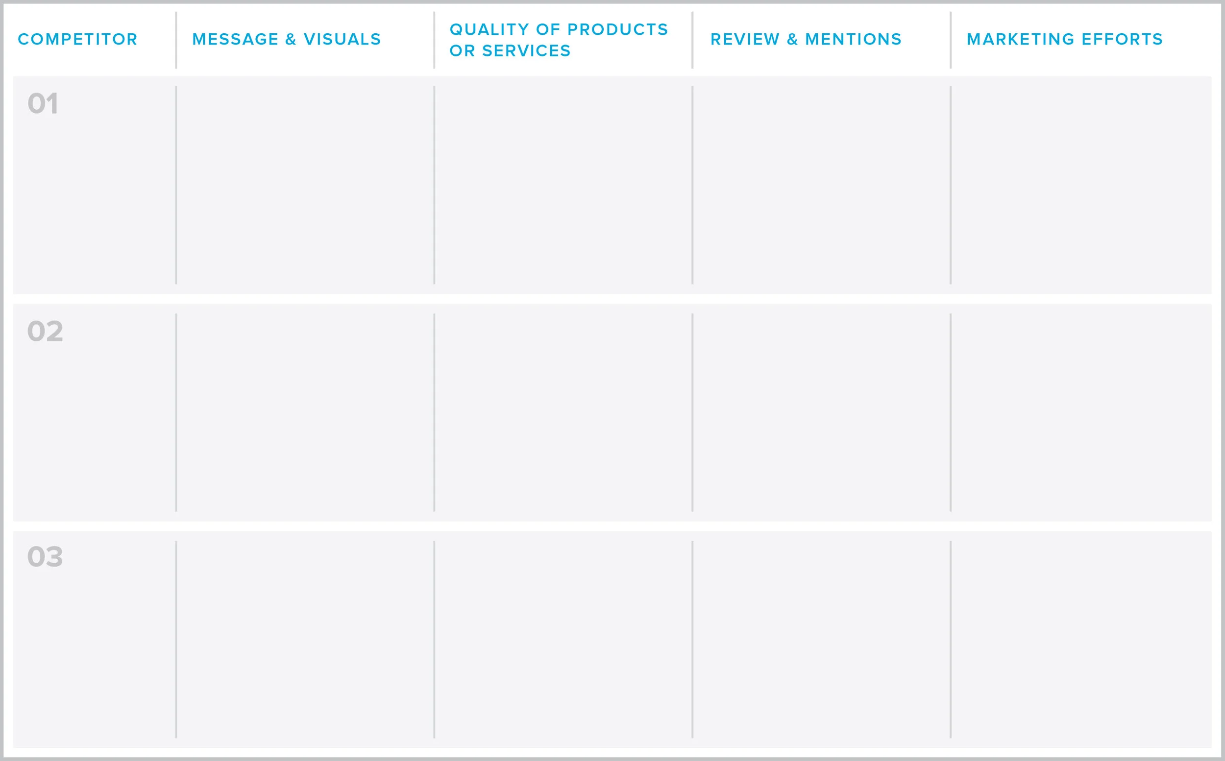 Competitor Analysis is the process of analyzing the strengths and weaknesses of your competitors within the market to identify potential opportunities and threats to your company and develop improved strategies to better position your company, brand and product. Understanding where your brand stands in comparison to competitors in the minds of consumers allows you to adjust or improve various elements and tactics of your brand and company to better position yourself within your industry.