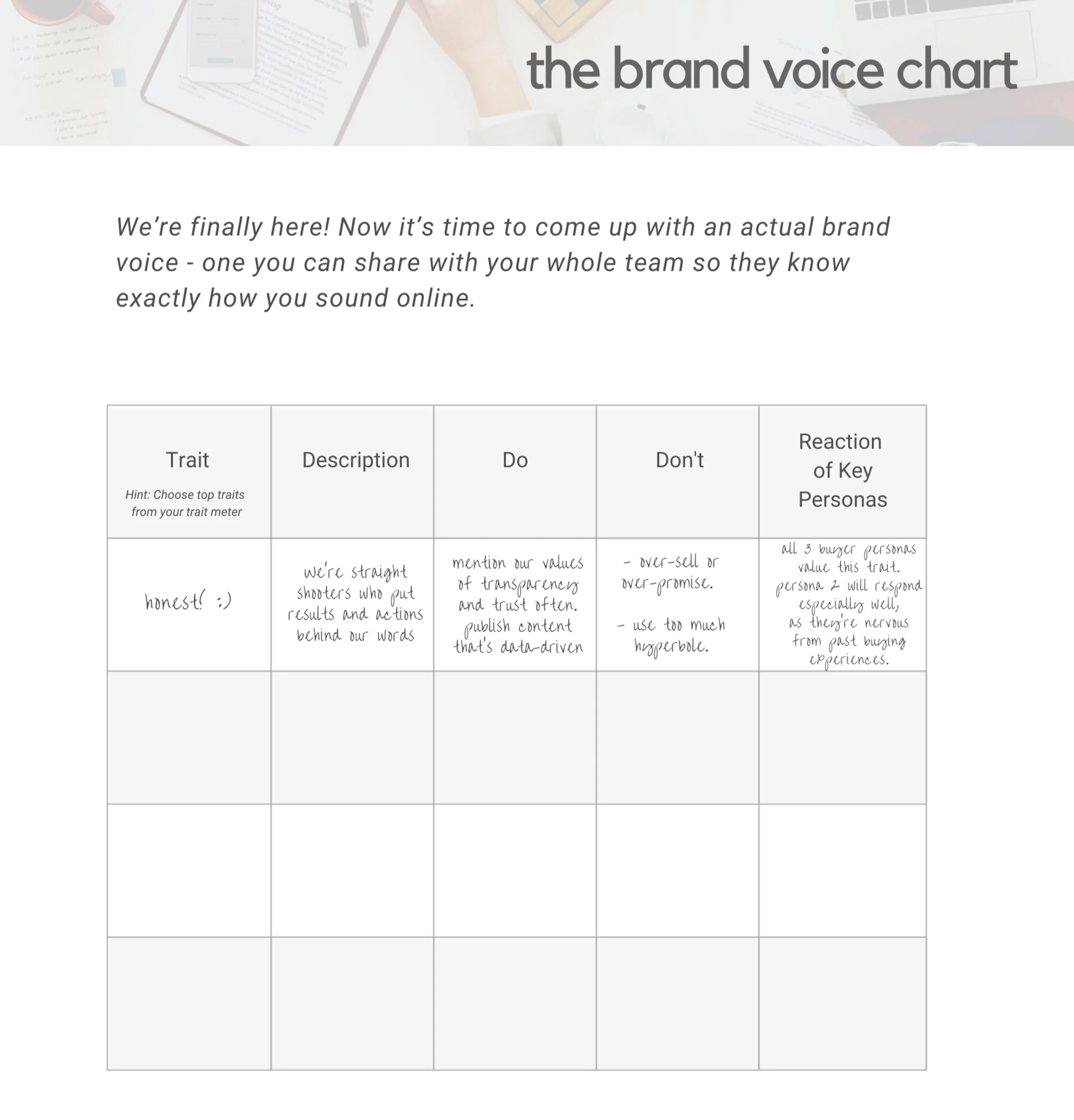 Brand Voice is the expression of brand personality and attitude when communicating with an audience, by using a consistent selection of words and language aligned with the traits of your brand personality.